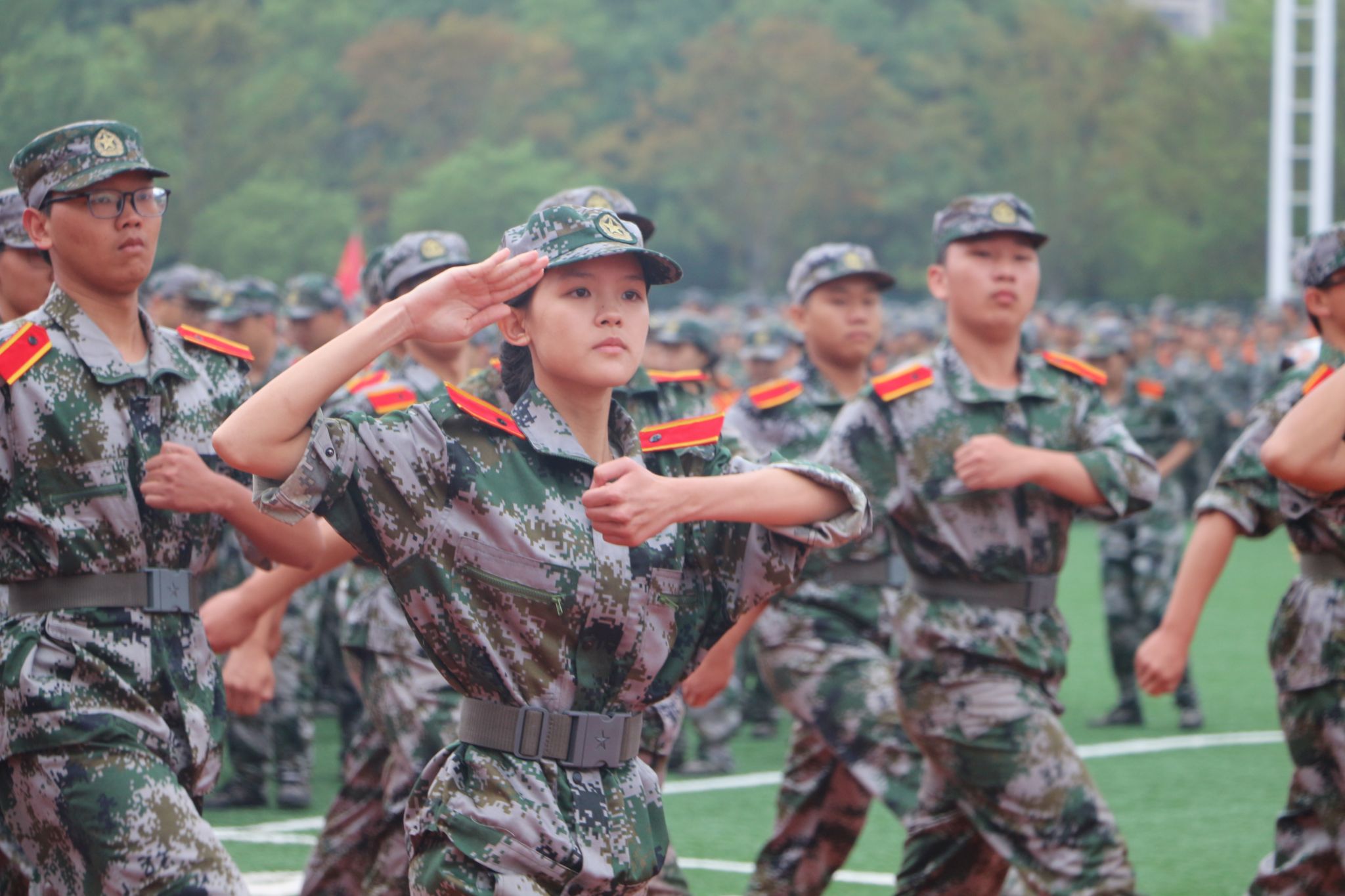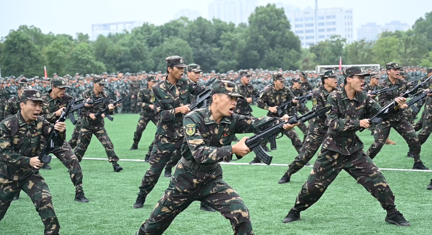 分列式进行曲响彻全场,教官分队持枪入场,眼神坚毅,步伐稳健,目光中透露出坚定与果敢。他们以豪迈的激情斗志、过硬的军事素养向全校师生展现昂扬奋发的精神风貌和青春风采。14个二级学院方阵紧随其后,身着戎装的新生喊着铿锵有力的口号,迈着整齐矫健的步伐,向全校师生展示军训成果,接受全场检阅。