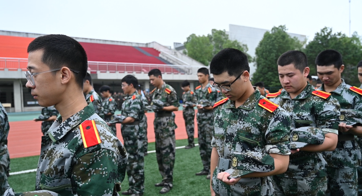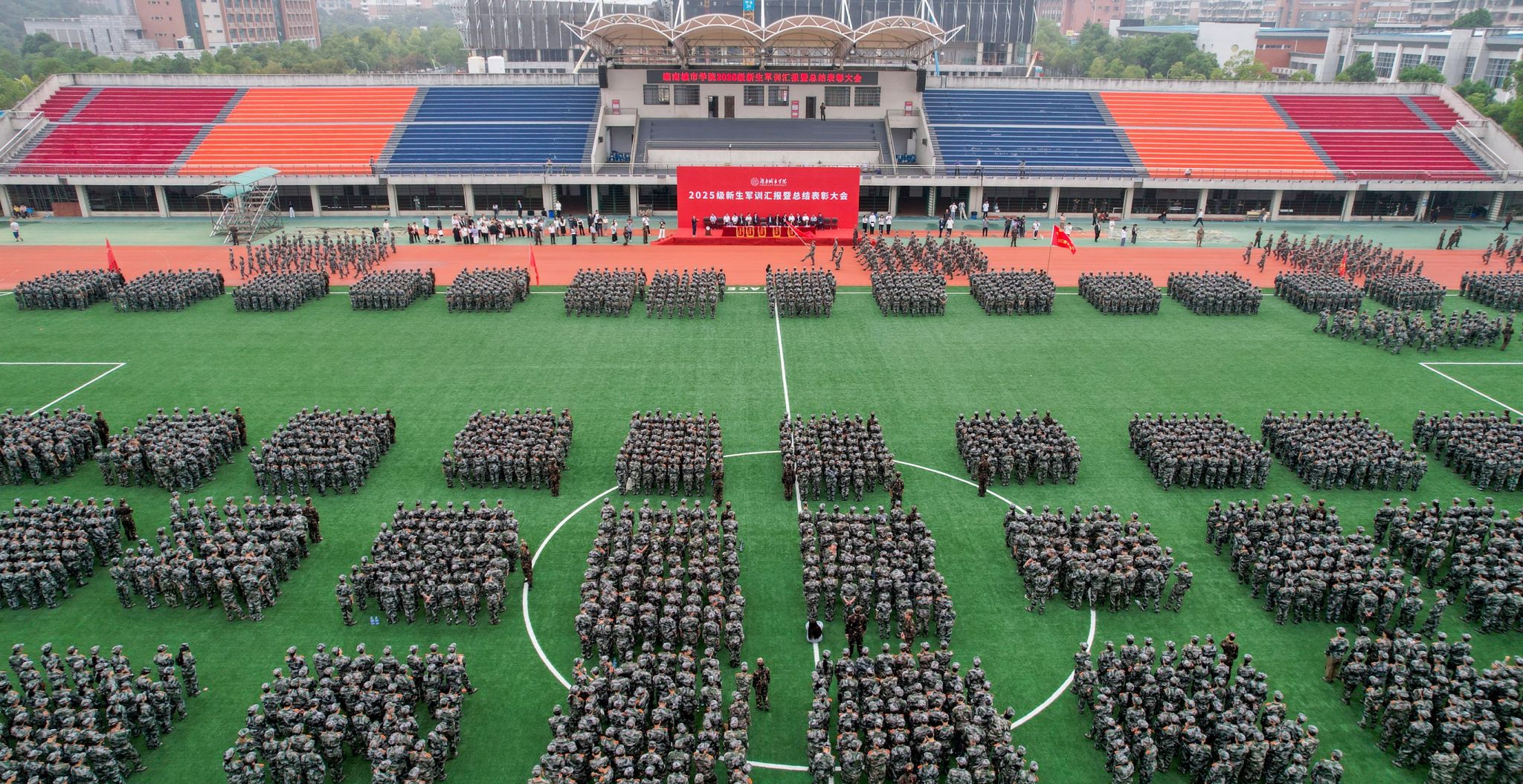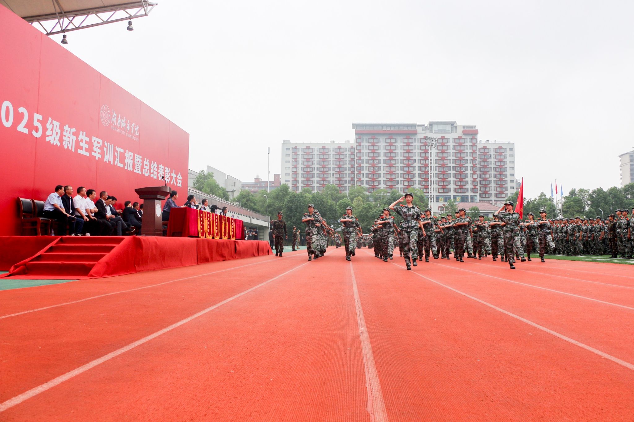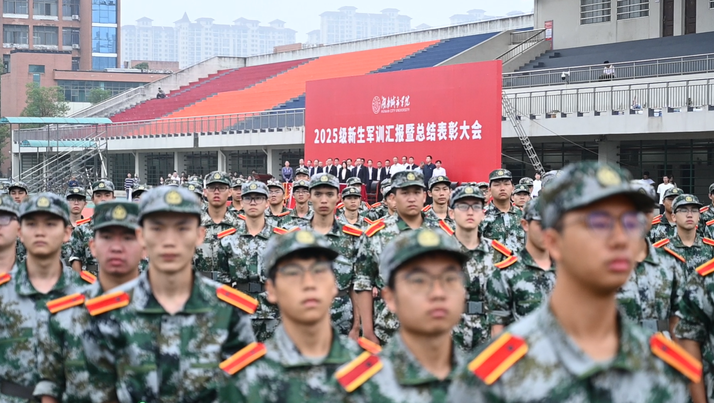 本网讯 9月30日上午8时,湖南城市学院2025级新生军训汇报暨总结表彰大会在学校东田径场举行。全场新生身着全套迷彩,以最昂扬的精神面貌迎接来自各方的检验。全体在家校领导出席大会。校党委书记何振宣布军训成果汇报表演正式开始,副校长雷存喜主持大会。