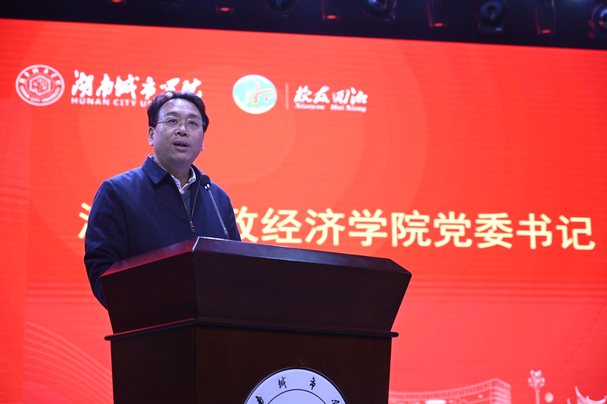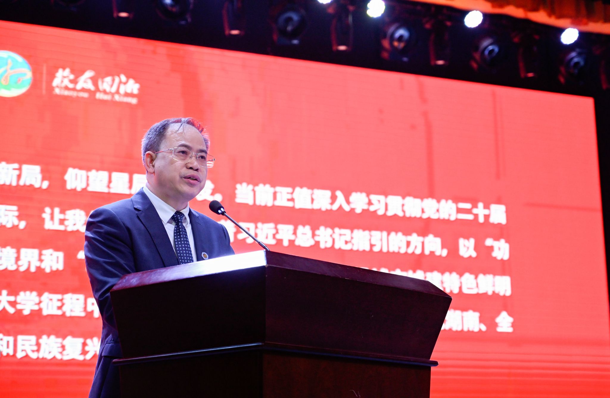 韩高年代表兄弟院校致辞。他表示,两校虽相隔万水千山,但因 “城市” 办学主题与“应用”育人定位深度结缘,兰州城市学院愿与湖南城市学院及全国同类院校深化合作,在人才培养、学科建设、科研创新等领域互学互鉴,将办学治校与服务国家需求紧密结合,携手为建设教育强国贡献力量。