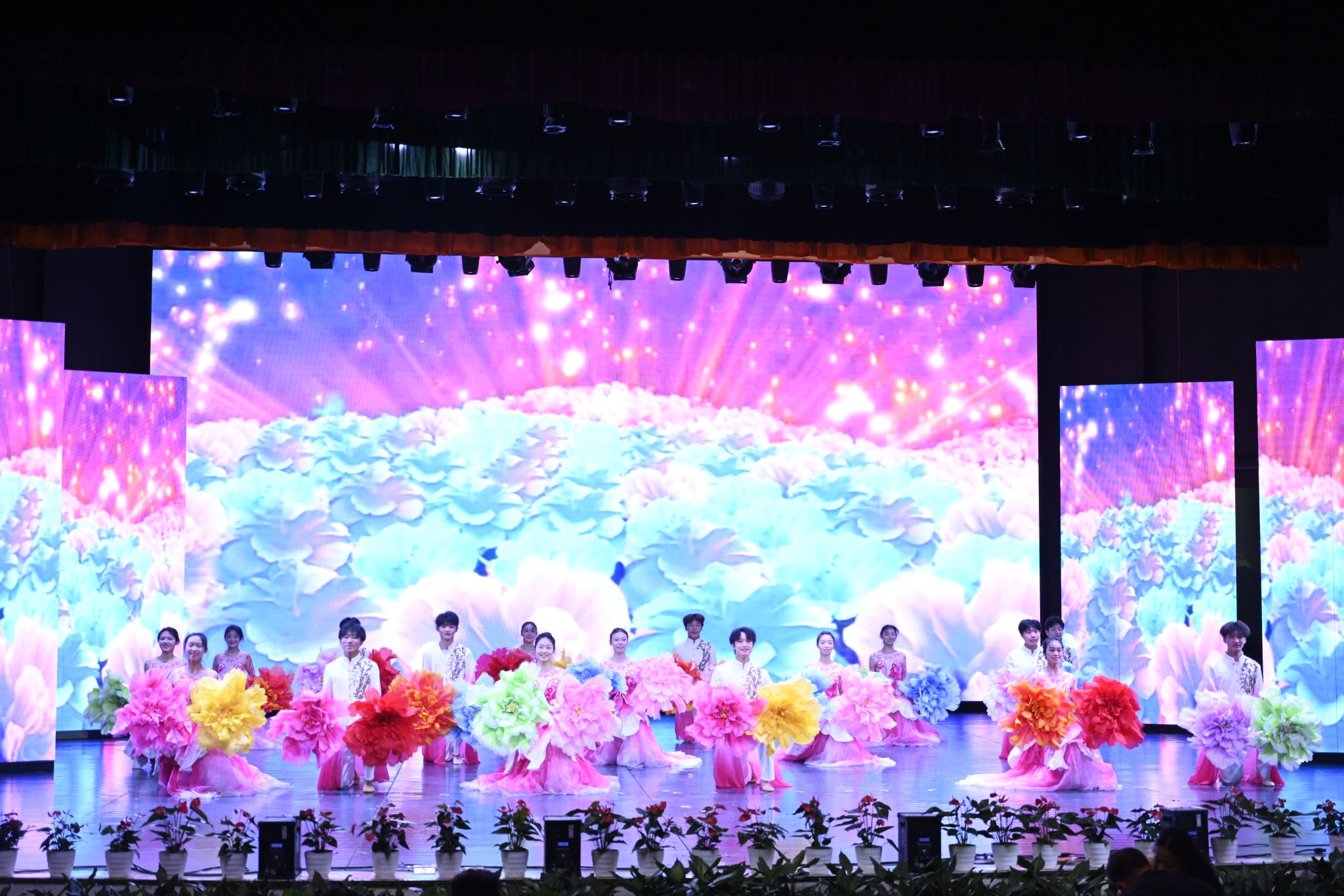 校园内彩旗高挂,巨大的宣传展板分外醒目,广大校友从大江南北回到魂牵梦萦的母校。学校音乐厅内洋溢着欢庆祥和的浓厚氛围,悠扬的音乐不绝于耳,璀璨的灯光交相辉映,大屏幕循环播放学校办学55周年主题宣传片《城市之光》,舞台两侧“五五传薪 树蕙滋兰 匠心熔铸千秋业”“久久为功 筑城强基 铁肩扛鼎万代梁”的对联异常显眼。四百余名校友、嘉宾、师生代表齐聚一堂,共同见证湖南城市学院办学55周年的荣耀时刻。