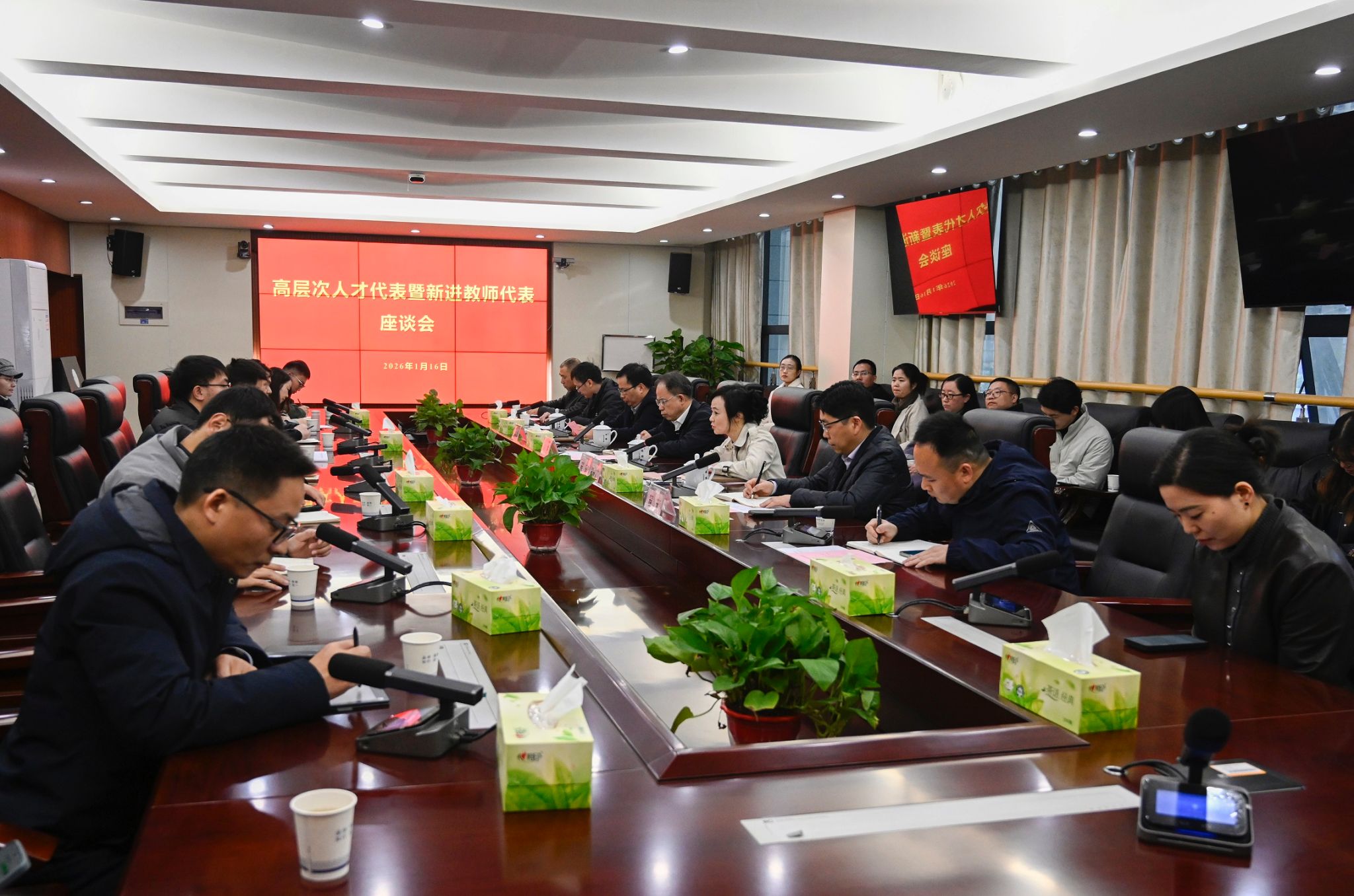 人事处、教务处、科研处部门负责人,各二级学院的高层次人才代表、新进教师代表参加会议。