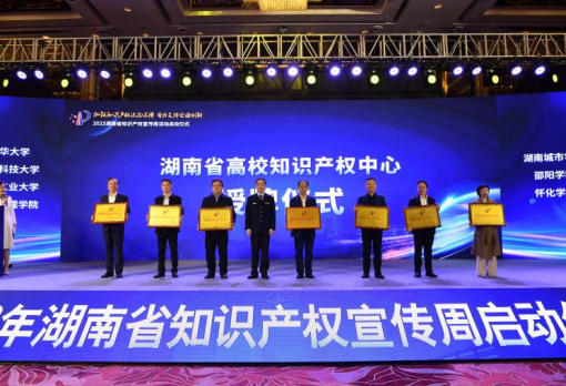 本网讯(供稿:科研处)4月23日上午,由湖南省市场监督管理局、湖南省知识产权局主办的2023年湖南省知识产权宣传周启动仪式在长沙举行。省市场监督管理局、省知识产权局局长钱俊君致辞,并就相关工作作了部署,副省长蒋涤非宣布湖南省知识产权活动周正式启动。会上专门举行了高校知识产权中心授牌仪式,校长何振代表湖南城市学院接受授牌。