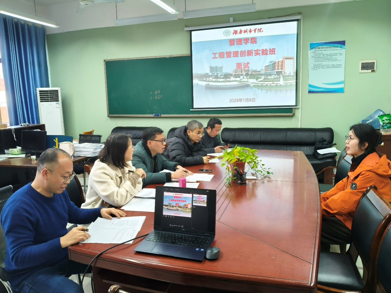 本网讯(通讯员:刘正夫)2026年1月6日下午3点,湖南城市学院管理学院工程管理专业创新实验班选拔面试在管理楼603与610教室同步举行。管理学院院长汤勇、工程管理专业系主任刘正夫、支部书记张胜和专业教师龙敬庭、彭志超、谌跃飞、刘思蕙、陈艳,以及辅导员陈小梅等多位老师共同参与评审。
