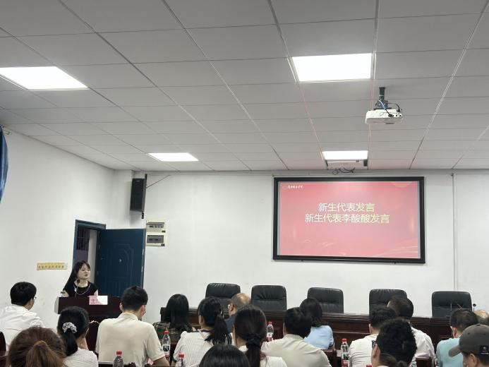 在新生代表发言环节,李酸酸同学分享了对专业领域的初步认知与未来展望,表达了珍惜时光、携手共进、为学院发展贡献青春力量的决心,引发了在场同学的广泛共鸣。